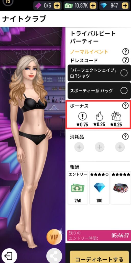 で、このスコアが☆4以上でダイヤ、☆5以上で未所有のアイテムがもらえるのでなるべく高いスコアを狙っていきたいわけです。