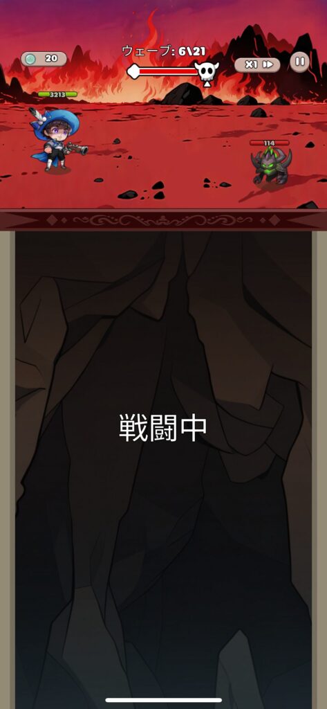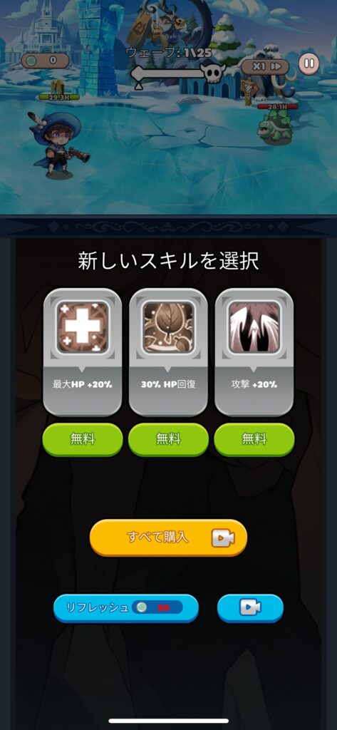 1チャプターが基本25ウェーブで構成されてるんですけど、各ウェーブごとに玉落としとスキル選択が挟まります。ついでに強制広告もたまに挟まります😠