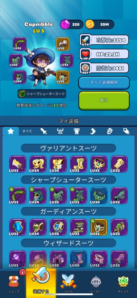 敵が強くない序盤はゴブリンスーツでスクロールを稼ぎつつ、戦闘が苦しくなってきたらヴァリアントスーツやシャープシュータースーツでステータスを底上げしていけばよいと思います。