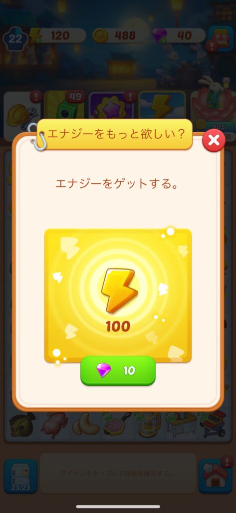 他のゲームだと、広告を見ることでエネルギーを回復できるなどのシステムがありますが、私がプレイした限りでは、そういったものがこのゲームでは確認できなかったですね。。