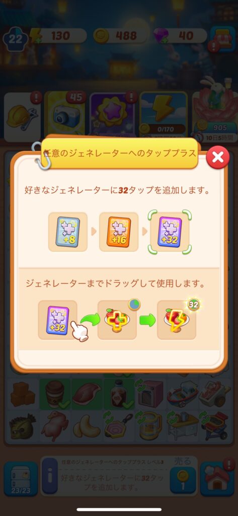 このゲームではアイテムを生成するジェネレーターが結構頻繁に手に入りますが、すぐにマージするのではなくて、アイテムを出し切って充電切れになったタイミングでマージすると、またアイテムが生成できるようになりお得です。