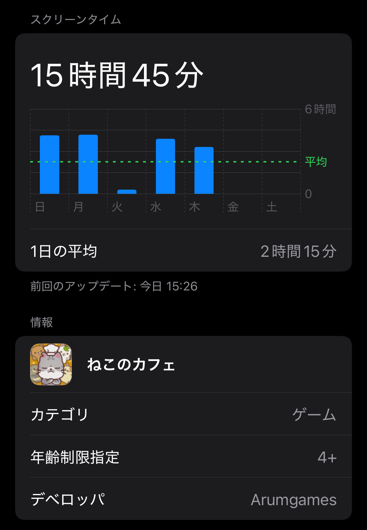 スクリーンタイム15時間45分でした。日数5日。