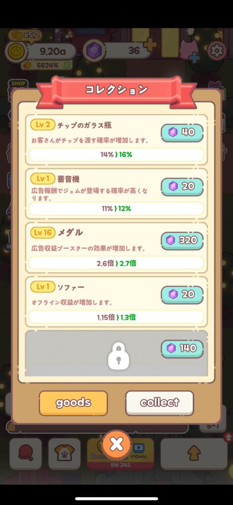 コレクションのメダルを強化していくとブースターの倍率がアップします。