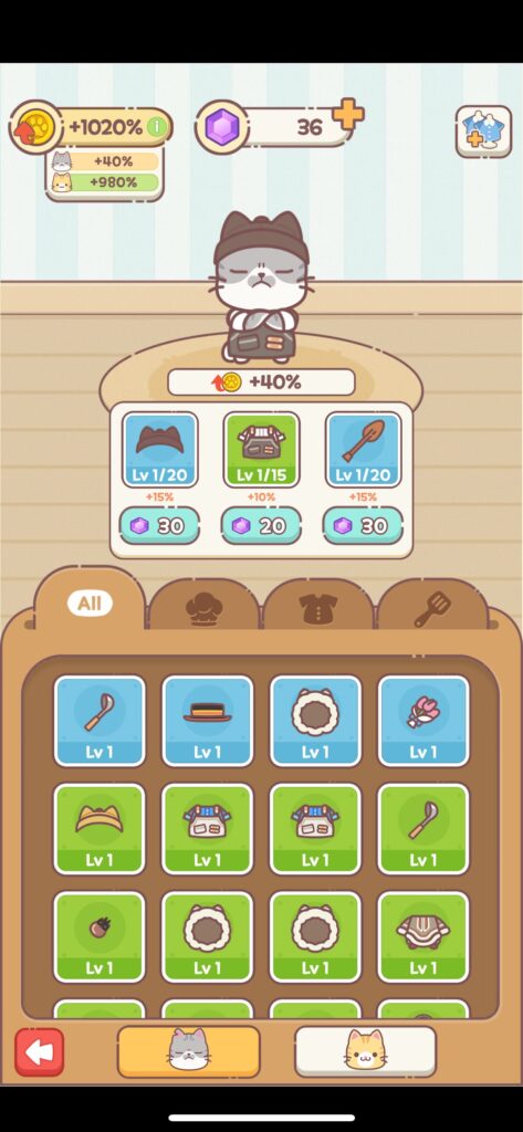 放置することでお金がたまっていくので、それを使ってレストランの設備をレベルアップしていきます。
