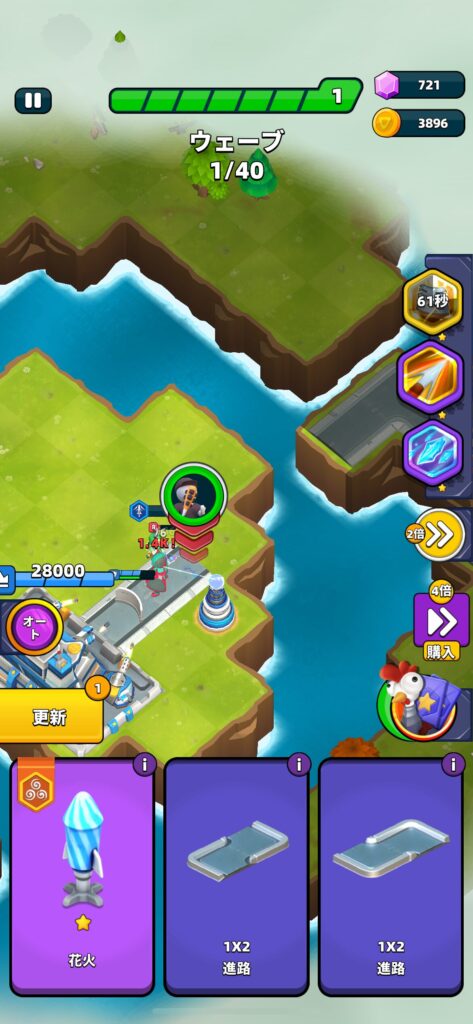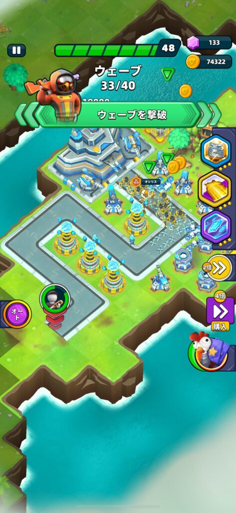上のスクショの状態だと守備隊一人あたりの体力が1230.2。これが3人出てくるので守備隊タワー1個につきおよそ3690要塞の体力が増えるようなもんだし、実質毎ウェーブ使えてダメージも出せる手強い壁だと筆者は考えています。ボスの攻撃も優先的に受けてくれるので時間稼ぎにもなる。
