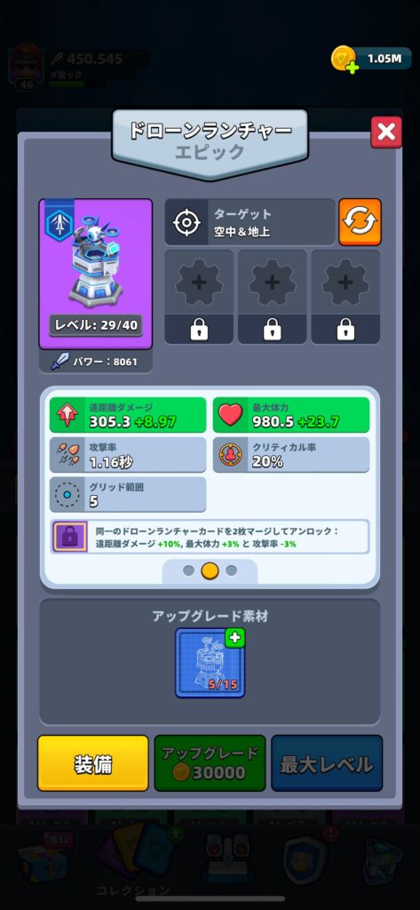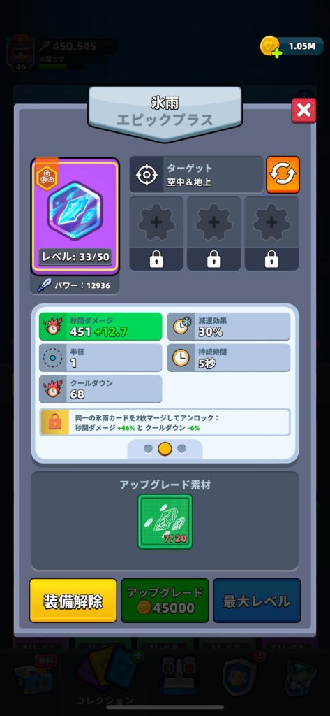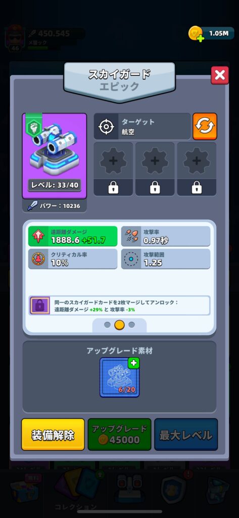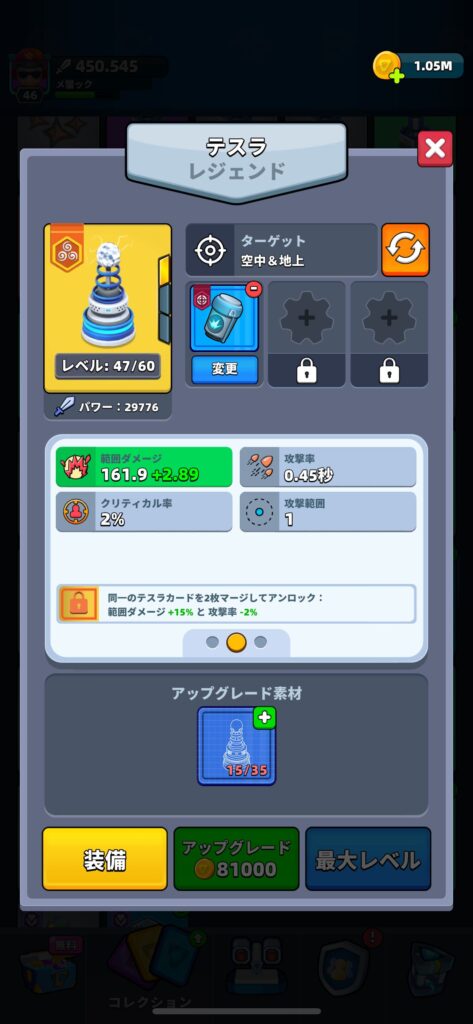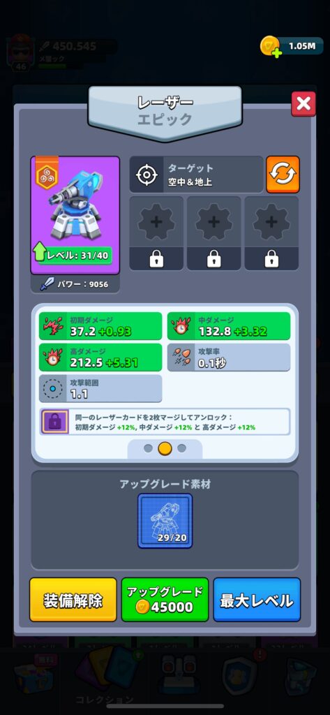 周回で資源が集まったらタワーやスキルのマージとレベルアップ、ホーム画面の右下にあるアップグレードを欠かさず進めていきましょう。