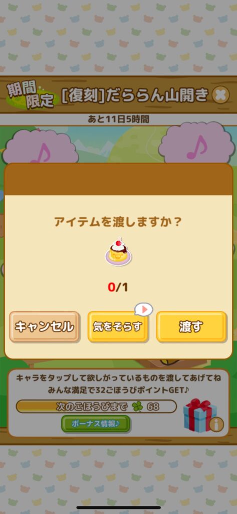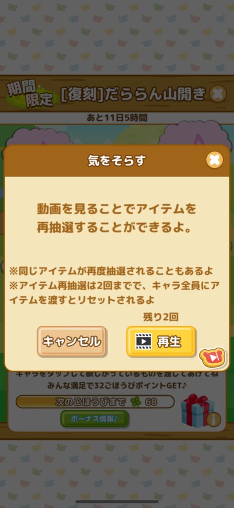 持っていないアイテムがリクエストされているときは「気をそらす」で動画を見て、リクエストを変えてしまいましょう。