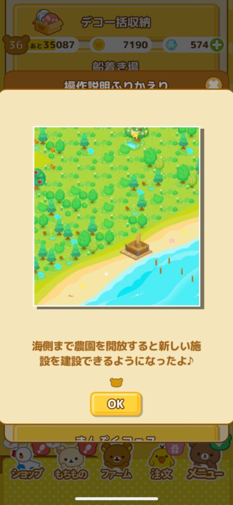 船着き場は農園を右側の海まで開拓すると利用できるようになります。