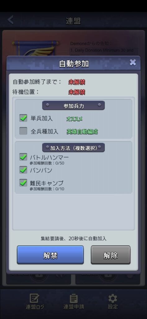 「連盟」→「軍事」→「自動参加」→「解禁」と設定しておくと、8時間はアプリを閉じていても自動的に集結に参加できます。